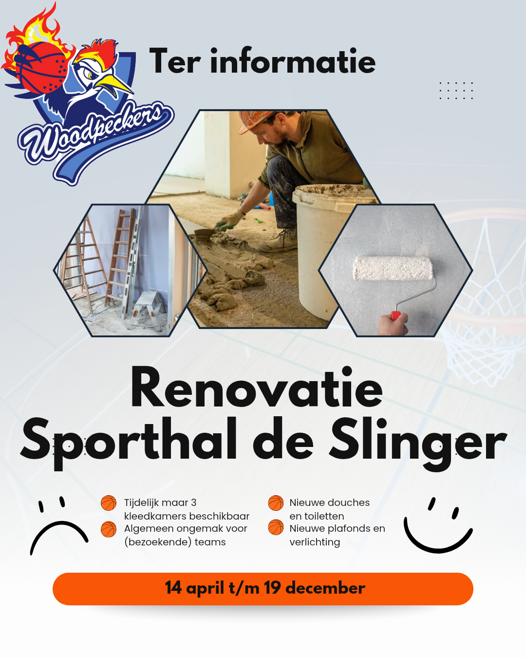 Bij BC Woodpeckers in Houten speel je basketbal op jouw niveau. Plezier vinden we daarbij het belangrijkst! Onze thuisbasis is Sporthal de Slinger. De sporthal wordt tussen april en december 2025 gerenoveerd door de gemeente. Er zijn mogelijk minder kleedkamers beschikbaar in deze periode. Onze excuses voor het ongemak.